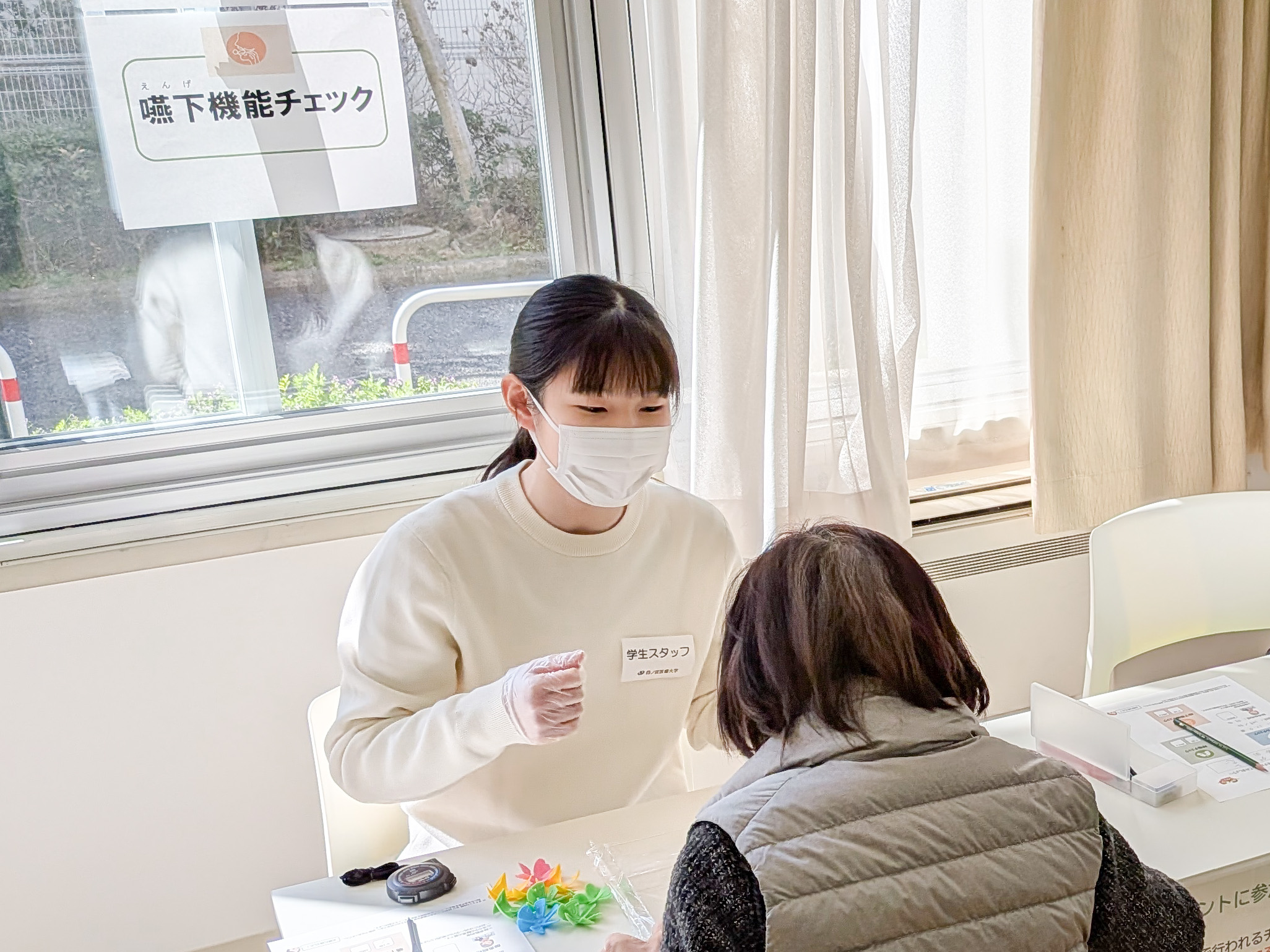 2026年3月11日(水)10:00~12:00、UR賃貸住宅南港ひかりの団地13号棟集会所にて、2月にも実施した言語聴覚学科の教員、学生スタッフ、本学の学生支援課の担当者による「健康チェック 測定会」を実施。前回に引き続き80名以上の方に参加いただき、大盛況のイベントとなりました。