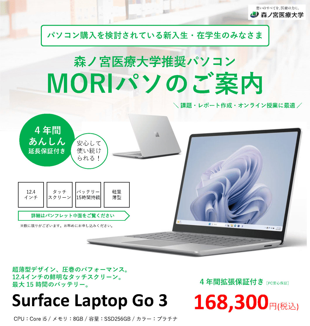 本学では推奨スペックを満たすパソコン(通称:「MORIパソ」)を特別価格で販売しています。4年間の拡張保証がついており、在学中安心してお使い頂けます。ご入学のタイミングで、まだパソコンをお持ちでない方や古いパソコンからの買い替えをご検討されている方は、「MORIパソ」を検討してみてください。