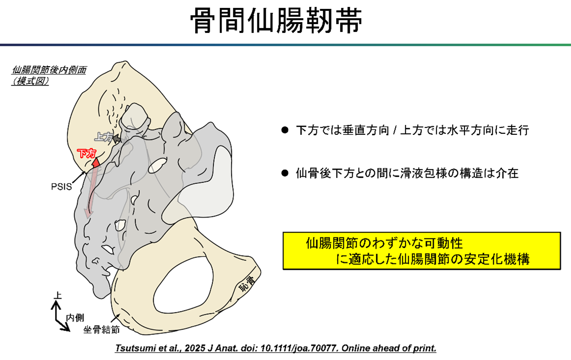 本研究では、仙骨と腸骨の間の狭い空間に存在する「骨間仙腸靭帯」に着目し、この靭帯を構成する線維の向きに規則性があることを明らかにしました。さらに、靭帯と骨の間には滑液包のような構造があることもわかりました。
