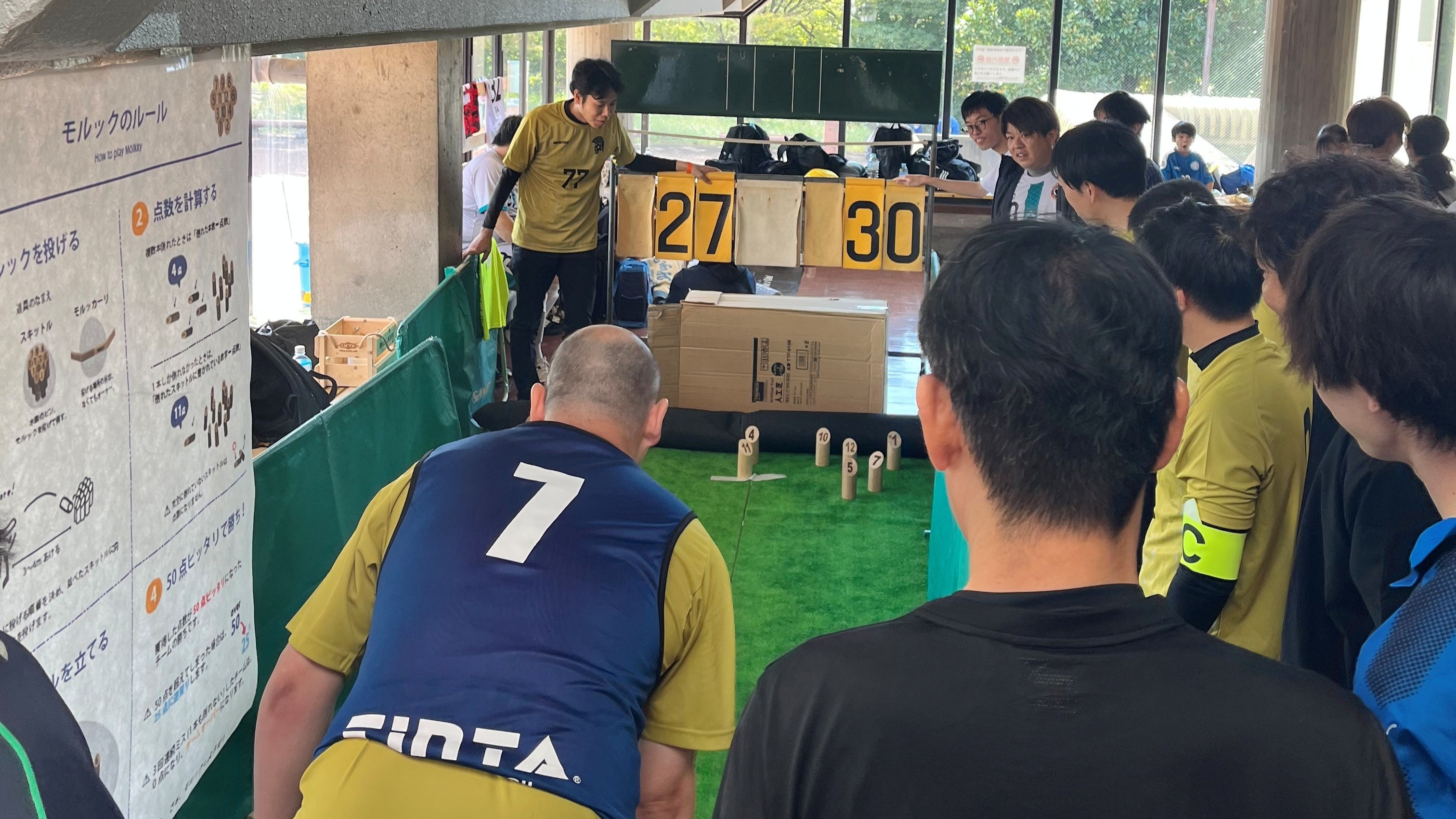 本学からは、総合リハビリテーション学部 作業療法学科の小川 泰弘准教授と勝原 勇希助教、そして学生26名が大会運営に携わり、スコア管理や招集業務などのコート運営を担当しました。さらに特設ブースでは、モルックを用いたスポーツ交流企画を実施し、性別や世代を超えた交流の場を創出しました。