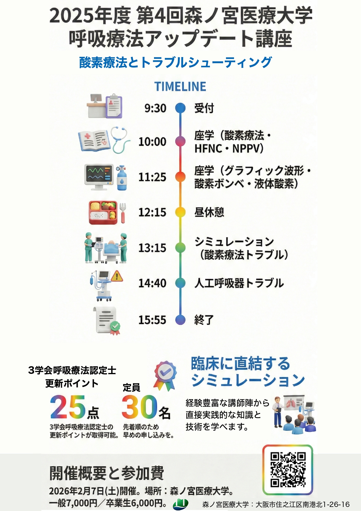 森ノ宮医療大学 呼吸療法アップデート講座は医療機関にお勤めの方に多数ご参加いただいております。なお、本講座にご参加いただくと3学会合同呼吸療法認定士更新点数が各25点取得可能となっております。