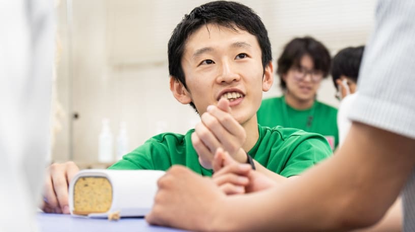 オープンキャンパスの学生スタッフは、たくさんの来場者の方と話せることを楽しみにしています。勉強や学生生活、受験勉強のことなど、どんな些細なことでもいいので、気軽に声をかけてくれると嬉しいです!