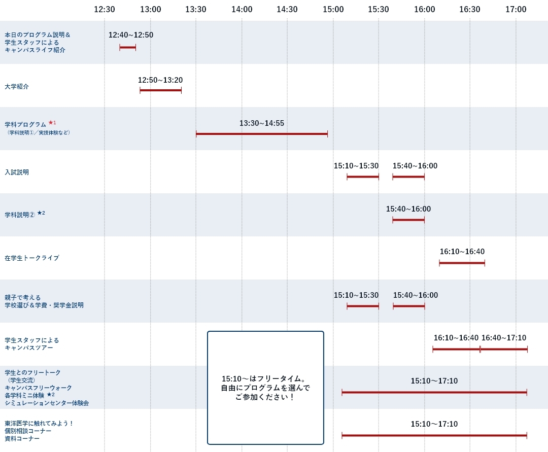 ★1 看護学科、理学療法学科、臨床検査学科、鍼灸学科については、参加申込時に希望するプログラムも予約する必要があります。事前に開催内容をご確認のうえ、ご予約ください。