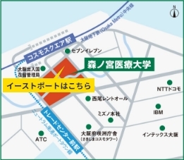 イーストポート1階が受付場所になります。電車でお越しの方はOsaka Metro中央線「コスモスクエア」駅「2番出口」より地上に出てください。